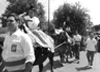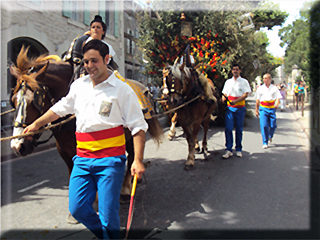 Défilé de la Carreto Ramado : les chevaux sont tenus en bride courte par les charretiers, et portent de jeunes provençaux, Arlésiennes, Mireilles et même de jeunes fouetteurs acrobates...
