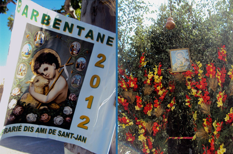La bénédiction de la Carreto Ramado a lieu sur le parvis de l'église Notre-Dame-de-Grâces, sous l'oeil bienveillant de St Jean-Baptiste, en bannière et en statue, porté par des membres de la Counfraré dis ami de Sant-Jan.