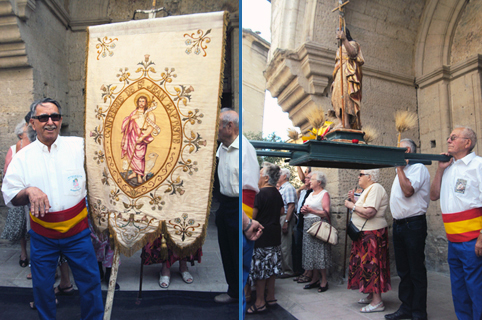 Sur le fronton de la Carreto Ramado, St Jean-Baptiste est entouré de glaiëuls jaunes et rouges.