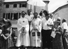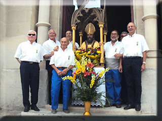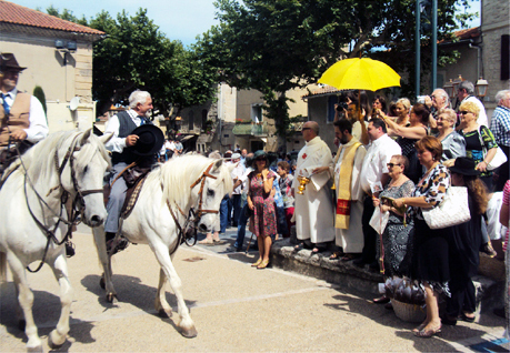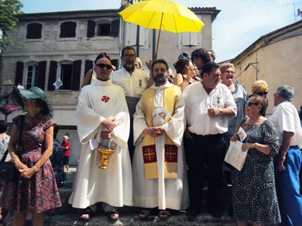 Il est ici entouré du diacre Gérard DUNAND et du Pdt de la confrérie Eric DELABRE, Yves BELVES tenant l'ombrelle protectrice.