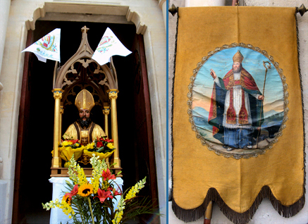 La bannière de St Eloi et le buste-reliquaire sont mis à l'honneur dans le choeur de l'église pendant la messe, puis portés en procession et enfin exposés devant l'église pendant la bénédiction de la Carreto Ramado.