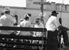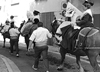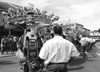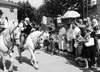 Le père ROLLAND, protégé par une ombrelle jaune, bénit tous les participants au grand défilé de la Saint-Eloi, ici les Gardians de Camargue.