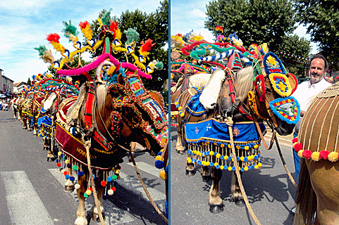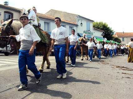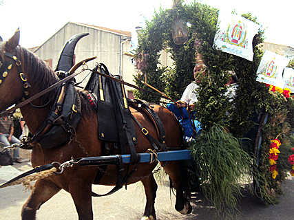 "La carreto ramado vai à la proucessioun emé sa cavaucado de bouié trefouli que marchon fieramen, cadun contro sa bèsti en fasènt peta lou fouit".
