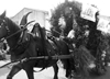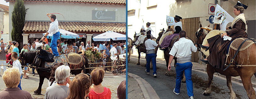Les chevaux du long attelage sont tenus à gauche par les charretiers en tenue traditionnelle, pantalon bleu, chemise blanche : la taillole, grise à Eyragues, est de couleur différente pour chaque village.