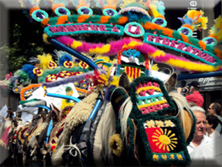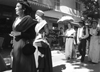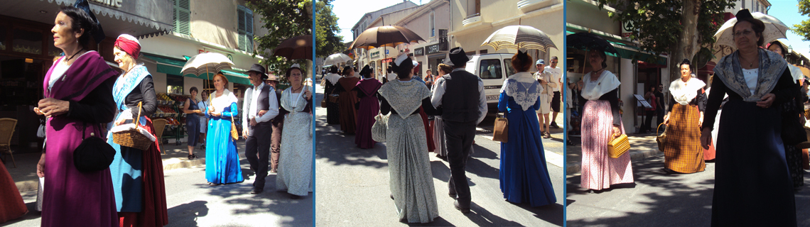 Les Arlésiennes dans le défilé provençal, avec leurs ombrelles, précèdent avec beaucoup d'élégance la Carreto Ramado de Saint Aloi.
