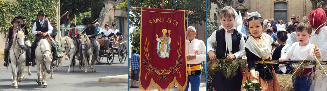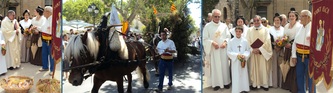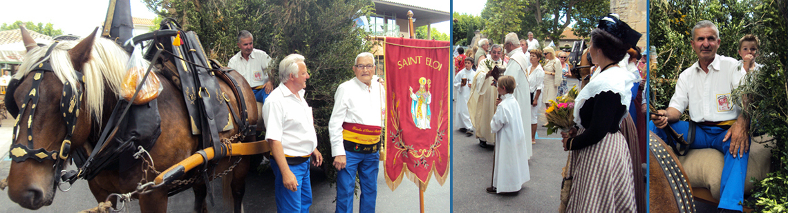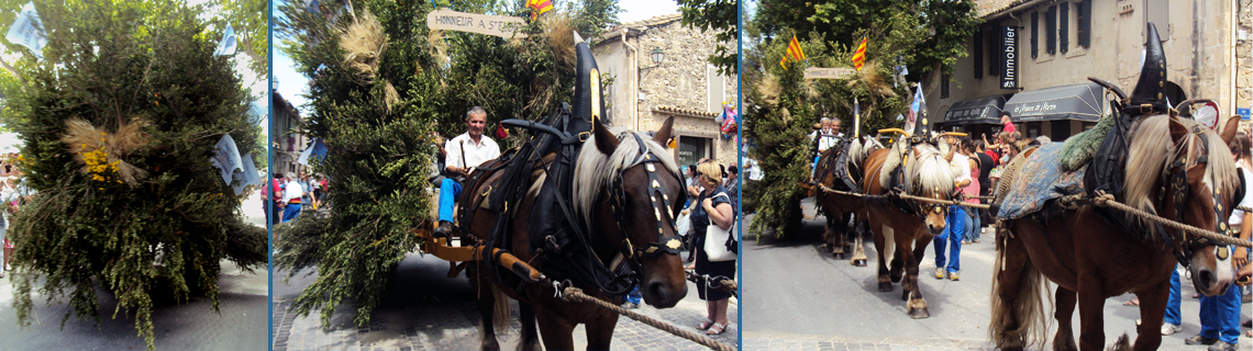 Enfin la charrette de Saint-Eloi apparaît, au bout de l'interminable attelage : elle est superbement décorée de branches de buis, d'ormeaux et d'olivier, et tirée par Lou limounié, le cheval placé dans les limons ; elle porte à l'avant une plaque gravée "Honneur à St Eloi".