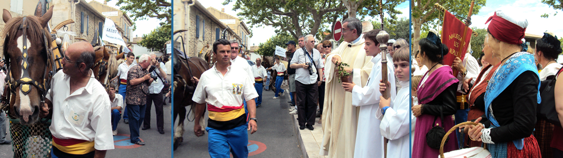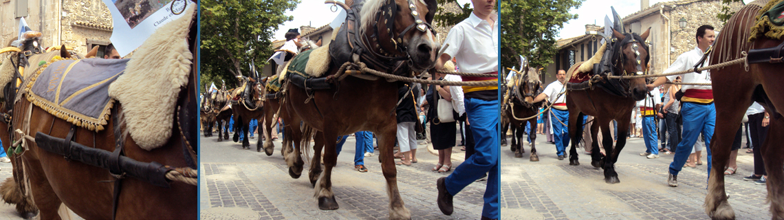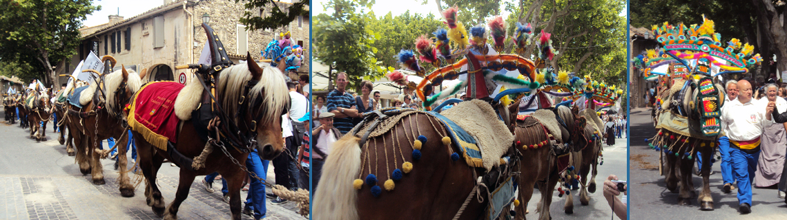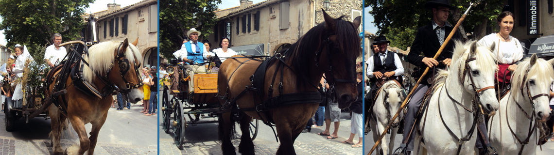 Le dimanche matin, après la messe des charretiers à 07H00 et leur "déjeuner", le son des fers des trente-deux chevaux lourds (comtois, breton, boulonnais, etc. ) de l'attelage de la carreto résonnent dans tout le village, après le passage des Gardians, du groupe arlésien l'Etoile de l'Avenir, des Fouetteurs de Saint-Rémy-de-Provence, puis des carrioles d'enfants et des demoiselles d'honneur de la reine d'Arles.