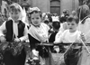 Les Demoiselles d'honneur de la Reine d'Arles arrivent dans une calèche, suivies un peu plus loin par la carriole des enfants, tout heureux de participer à la fête dans le défilé.