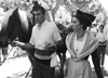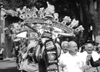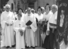 La Carreto Ramado de Sant-Aloi repart avec le défilé, photo souvenir du Père Robert Delprète entouré du Diacre Henri Grange et de l'enfant de choeur, des Demoiselles d'honneur de la Reine d'Arles et de la bannière de Saint-Eloi avec son porteur.