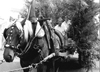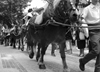Derrière les Gardians sur leurs chevaux Camargue à la robe blanche suivent plusieurs voitures hippomobiles, attelées pour la plupart à des chevaux lourds à la robe baie, tons roux de marron à chocolat...