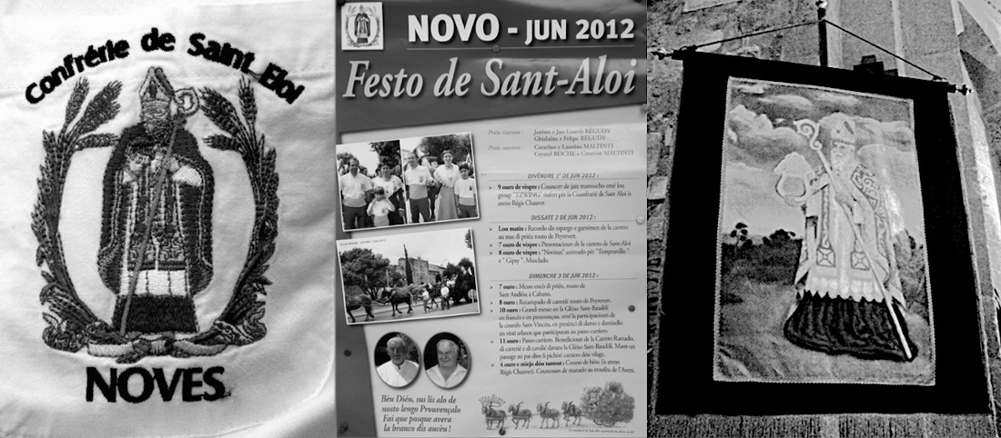 NOVES - 03 juin 2012 / Festo de Sant Aloi : écusson de Saint-Eloi, porté par les membres de la Confrérie ; affiche de la Saint-Eloi 2012 ; bannière de la Confrérie de Saint-Eloi de Noves.