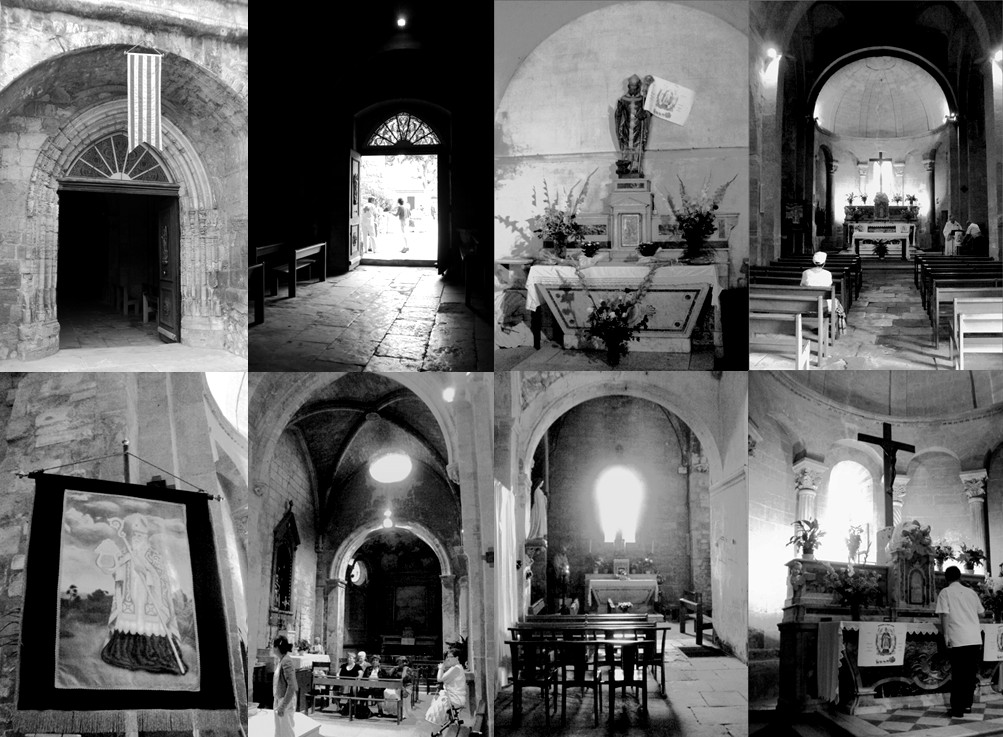 Eglise paroissiale Saint-Baudile, le portail d'entrée, l'autel de saint Eloi, la nef romane, la bannière de procession dans le choeur, les nefs collétérales, l'autel décoré avec les fanions de saint Eloi.