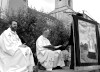 NOVES - 03 juin 2012 / Festo de Sant Aloi : les fidèles se rassemblent sur la parvis de l'église Saint-Baudile.avant la grand-messe. Le carillon des cloches va retentir pour l'entrée en procession dans l'église, bannière suivie des Arlésiennes et Provençaux costumés.
