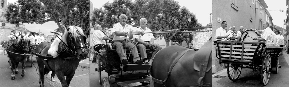 NOVES - 03 juin 2012 / Festo de Sant Aloi : le passage de la charrette de l'orchestre dont on entend les cuivres de très loin ; les fanfares peña sont présentes dans toute la région pour accompagner notamment les fêtes taurines dans les arènes, mais aussi de nombreuses fêtes traditionnelles.