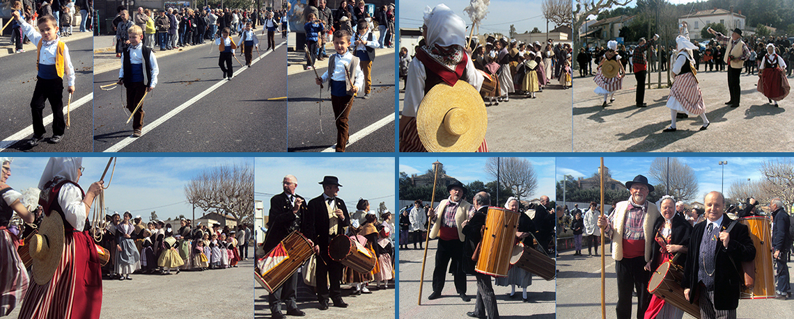 BARBENTANE 16 mars 2014 _ Les Fouetteurs costumés du groupe LA RIBAMBELLO de Graveson évoquent les charretiers de l'ancien temps, celui des chevaux de trait, et font claquer leur fouet avec une grande habilité. LI DANSAIRE DOU GRAND CAVAOU, de Fos-sur-Mer : en haut à droite, la danse des Epées, et en bas, arrivée de F. Olive (avec son bâton de berger), Président du groupe Fosséen.
