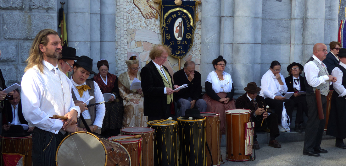 Fin de la procession du Saint-Sacrement sur le parvis du Rosaire, animée par les Chantres du Sanctuaire, la Chorale Sainte-Cécile de Rognonas et les tambourinaires. Bénédiction et clôture du pèlerinage par Mgr Pierre-Marie Carré, Archevêque de Montpellier. Remerciements par M. Guy Chaptal, Capitaine de la Nacioun Gardiano.