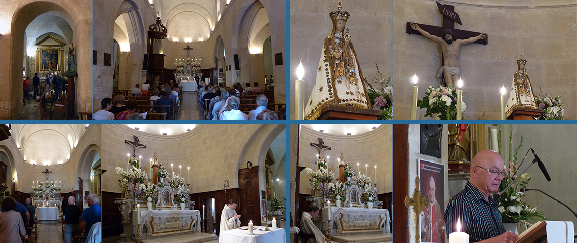 Maillane 29 août 2014 _ La messe des Gravesonnais, célébrée par le P. Emmanuel Kauffmann ; le temps du pèlerinage, la Madonne Maianenco est placée sur un piédestal au-dessus de l'autel : c'est une petite statue de bois d’une Vierge assise tenant l’Enfant Jésus, elle est recouverte d’une étoffe précieuse qui ne laisse apparaitre que sa tête et celle de son chérubin.