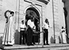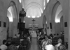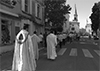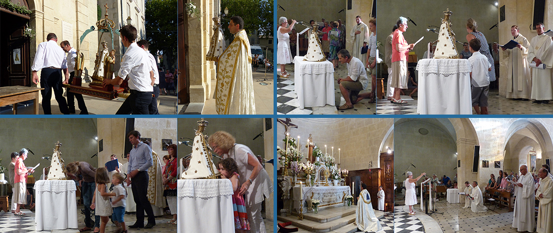 Maillane 29 août 2014 _ La procession est terminée, le Père Brissier va porter la statue de Notre-Dame de Grâce jusque dans le choeur pour la vénération par les pèlerins, avant le Salut au Saint-Sacrement ; la vénération de la statue miraculeuse est un moment d'intense ferveur, chacun venant s'abaisser voir s'agenouiller devant Notre-Dame pour baiser un pan de son manteau.