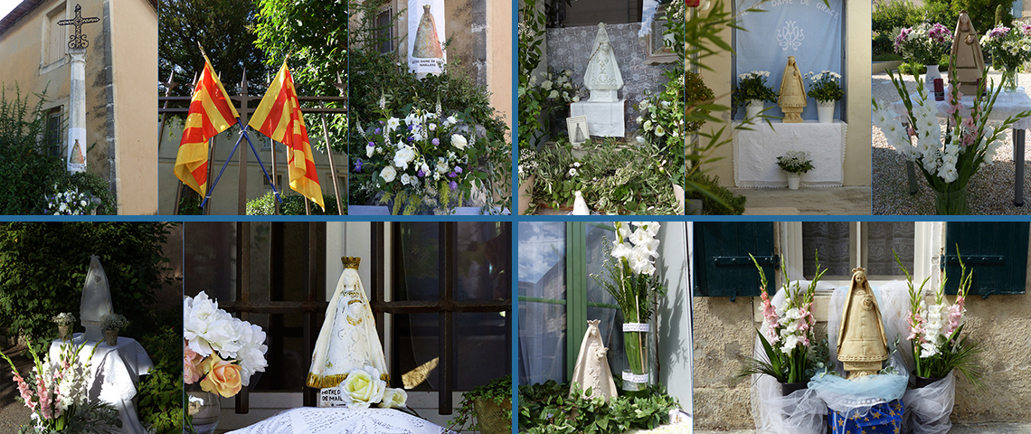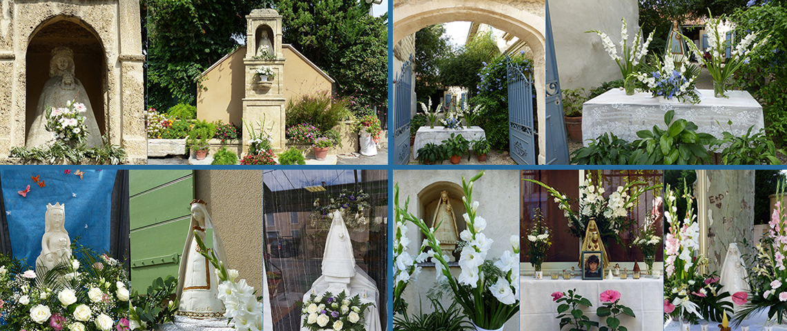 Maillane 29 août 2014 _ Les habitants ont coutume d'ériger de petits reposoirs décorés de fleurs en l'honneur de la Madonne Maianenco ; oratoire en pierre de Rognes érigé en 1954, l'étoile du Félibrige est gravée sur le cippe ; ici, la Madonne trône majestueusement à l'entrée d'une propriété, entourée de glaïeuils blancs, là elle est dans la vitrine d'un magasin...