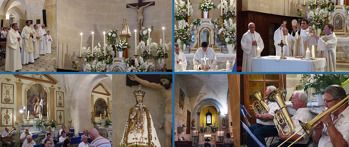 Maillane 29 août 2014 _ L'autel a été magnifiquement décoré de fleurs blanches et roses ; la Muso Maianenco, qui a fêté son 200°anniversaire en 2011, joue ses plus belles partitions pour Notre-Dame de Grâce ; à la fin de la cérémonie les pèlerins chantent le Cantico : "Nosto-Damo de Gràci, Que nous avès sauva, Vous venèn rendre gràci, Coume avèn toujour fa !"