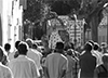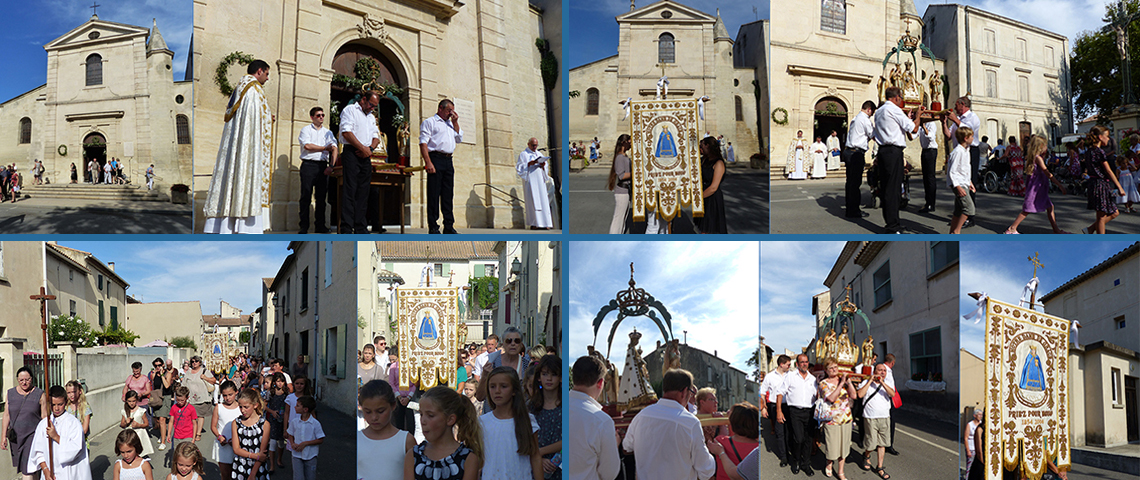 Maillane 24 août 2014 _ En tête, la croix portée par un enfant de choeur, elle est suivie des enfants du village, puis vient la bannière de Notre-Dame de Grâce, et enfin la statue sous son dais portée à tour de rôle par les pèlerins ; le long cortège faisant demi-tour à un certain point, le flot montant des pèlerins croise le flot descendant, donnant l'impression d'une marée humaine ...