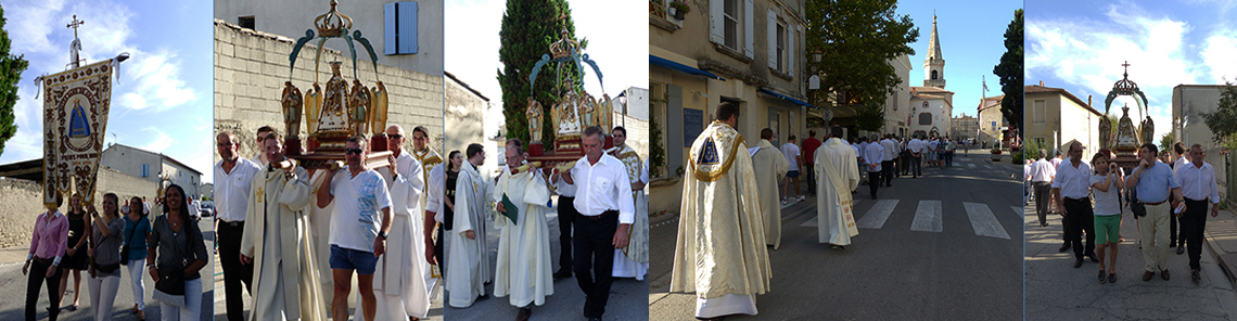 Maillane 29 août 2014 _ Les Prieurs de Notre-Dame encadrent soigneusement le brancard supportant le dais, afin d'aider des porteurs plus faibles qui éventuellement pourraient ployer sous la charge ... Le long cortège a sillonné tout le village, sans doute de la même façon qu'en 1854, lorsqu'il passait devant chaque maison où il y avait des malades atteints du choléra, qui étaient guéris instantanément ; l'église est en vue, c'est au tour du clergé de porter la statue miraculeuse ...