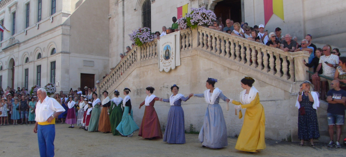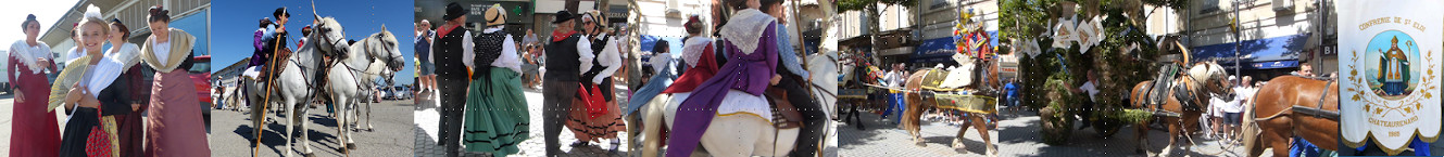 CHATEAURENARD _ La procession de Saint-Eloi passe deavnt l'église Saint-Denys, des Arlésiennes exécutent une farandole tourbillonnante.