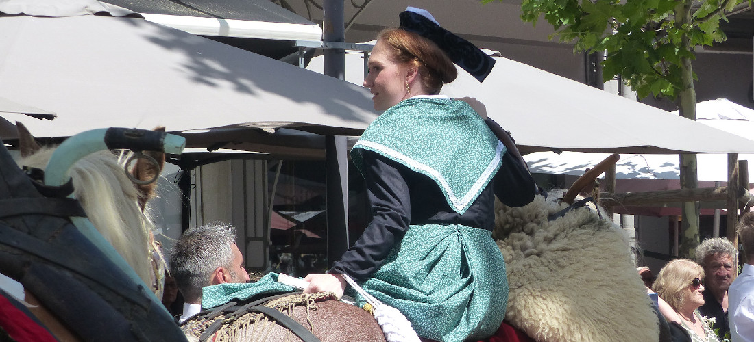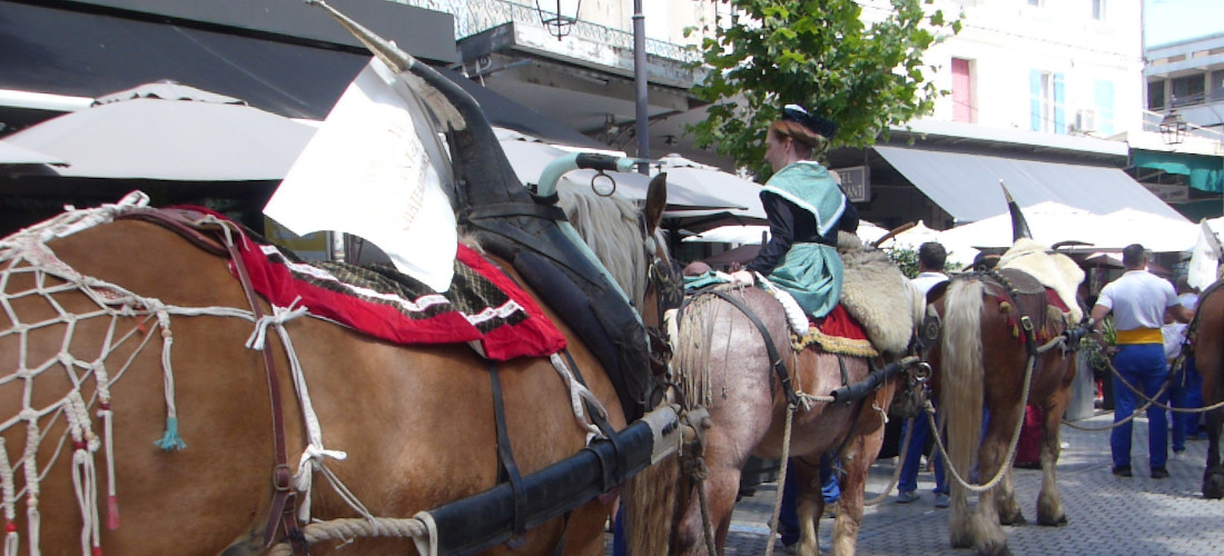 Le long cortège provençal, avec les Arlésiennes, les Gardians et les calèches, est passé d'abord devant l'église paroissiale Saint-Denys pour la traditionnelle bénédiction, par le Père Lazare, de la Carreto et de son attelage, avant de faire deux autres passages en ville.